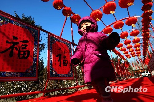 2月3日,一名小朋友在北海公园一处由灯笼和福牌布置好的长廊里奔跑。为了喜迎新春佳节,北海祈福迎春文化活动将于近期拉开帷幕。中新社发 富田 摄