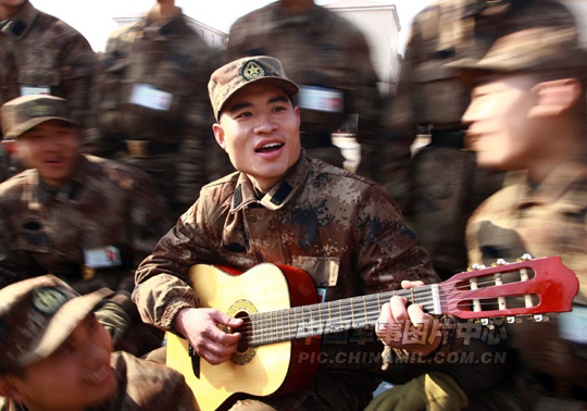 南京军区某部新兵六连大学生新兵王慧,参军前曾就读于福州大学人文社会科学学院音乐学专业,十分擅长合唱指挥、歌曲教唱。入伍以后,他充分发挥自身特长,在连队建立起文体小组,并担任文体创作小组组长、音乐辅导员,配合机关组织策划编排节目,被大家亲切地誉为“音乐总监”。前不久,连队在他自编自导、精心策划的合唱歌曲在新兵营组织的“情暖军营”主题歌咏比赛上获奖。面对军营生活,王慧十分坦然,这只是我军旅生涯的刚刚开始,我要把部队作为建功新立业的平台,充分展示自己,让音乐给战友们带去更多的快乐与欢笑。