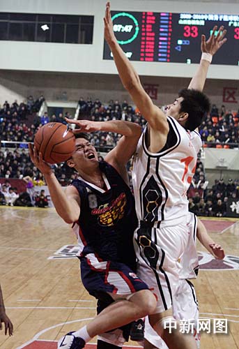 2月3日晚,09-10赛季CBA联赛第二十轮继续进行。拥有CBA最大牌外援马布里的山西汾酒男篮坐镇主场山西太原滨河体育中心迎战卫冕冠军广东东莞银行男篮。本场比赛,首节山西队一度领先广东,然而第二节比赛山西仅得16分,广东连续攻击反超比分并确立领先优势,下半场虽然山西多次将分差缩小,但最终因整体实力差距败下阵来,山西主场104:113不敌广东男篮,遭遇三连败,而广东男篮则迎来七连胜。摄影:张云