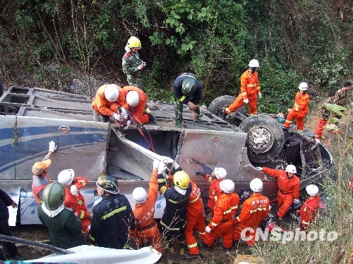 2月8日下午2时许,广西河池市境内,一辆从广东东莞开往四川的大客车与一越野车碰撞后,翻下100多米的悬崖,造成7人死亡,50人受伤。图为河池消防官兵等在现场救援。中新社发 叶大勇 摄