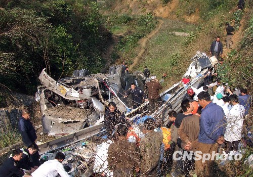 2月8日下午2时许,广西河池市境内,一辆从广东东莞开往四川的大客车与一越野车碰撞后,翻下100多米的悬崖,造成7人死亡,50人受伤。图为事故救援现场。中新社发 叶大勇 摄
