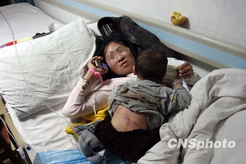 2月8日下午2时许,广西河池市境内,一辆从广东东莞开往四川的大客车与一越野车碰撞后,翻下100多米的悬崖,造成8人死亡,49人受伤。图为伤者母子给家人电报事故消息。中新社发 叶大勇 摄