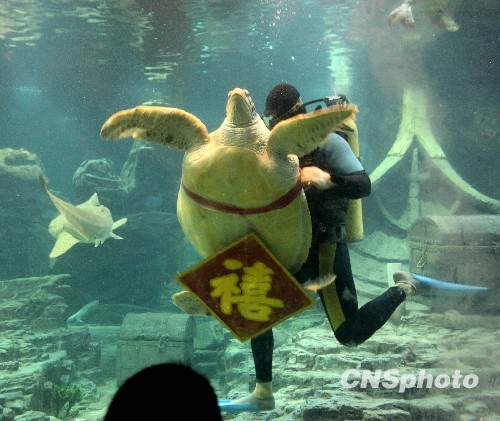 2月7日,武汉东湖海洋世界的企鹅、海龟纷纷穿上节日“盛装”,喜迎新春。