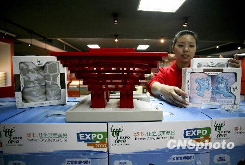 2010年2月9日,工作人员在上海世博会特许商品北京旗舰店(团购展示中心)内准备世博纪念品。在北京金街的王府井工美大厦上海世博会特许商品北京旗舰店隆重开业。工美集团凭借着成功运营奥运旗舰店的经验,再次得到上海世博会特许产品经营办公室的授权,运营北京地区上海世博会特许商品北京旗舰店(团购展示中心)。世博北京旗舰店营业面积800余平方米,经营上海世博会特许商品包括贵金属金银章、金银条、金银币、瓷器、徽章、玩具、服装、文具、家纺、玉石、工艺品、饰品、雨伞、箱包、玻璃制品等二十多个类别,品种5000余款,是北京地区开设的面积最大、品种最全的上海世博会特许商品旗舰店。其中,工美大厦一层营业面积300平方米,四层营业面积500平米,主要功能为特许商品销售,通过完美的形象展示打造上海世博会特许商品北京旗舰店团购展示中心。
