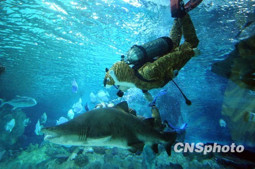 2月9日,北京某海底世界的镇馆之宝沙虎鲨与潜水员一起排练新春演出。对于这头沙虎鲨来说既将要到来的农历虎年将是它在中国度过的第一个虎年。这头从南非远道而来的贵客要和游客一起庆祝它的本命年的到来。沙虎鲨是海底世界最威风的鲨鱼,一口尖利的牙齿,威武的身材和独来独往的个性让它赢得了海中老虎的称号。春节期间游客将看到海底世界的工作人员身穿老虎服装,与海洋动物一起给全球华人拜虎年的特殊表演。