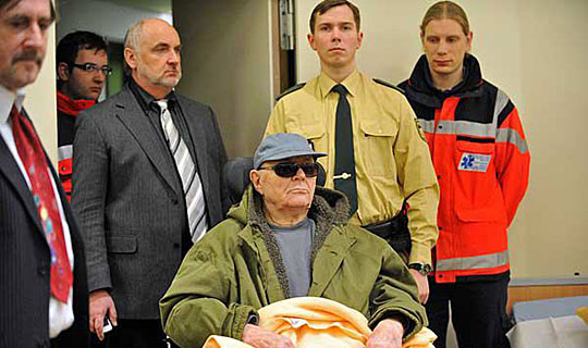 第二次世界大战时期纳粹嫌疑人约翰·德米扬鲁克乘坐轮椅到达德国慕尼黑地区法院接受审讯。