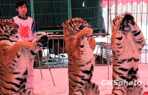 2月11日,河南许昌灞陵桥景区内,驯兽师在训练老虎。随着农历虎年临近,许昌灞陵桥景区加紧相关节目训练,准备春节期间向市民呈现精彩表演。许昌灞陵桥景区从正月初一到初七将举行“真虎拜年送吉祥”活动,游客在确保安全前提下可与老虎亲密接触、拍照留念。