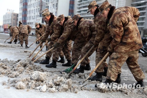 2月10日晚开始,冻雨加雪袭击河南许昌,城区道路结冰。驻许某部总队出动了1000余名官兵上街清理冰雪,确保市民出行畅通。