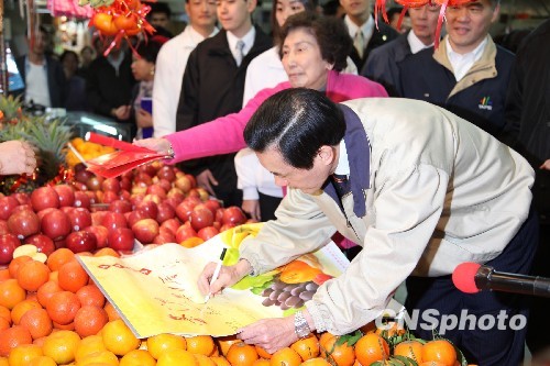 图为在赖太太的水果摊,马英九应邀在一份挂历上签名,秦妈妈给水果商贩送红包。中新社发 耿军 摄