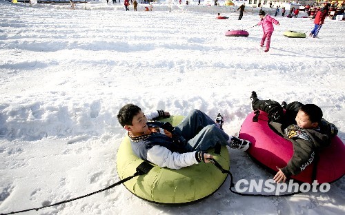 2010年2月21日,北京玉渊潭公园内,游客们纷纷享受着暖日里冰雪世界的欢乐。北京当日最高气温飙升至14度左右,而首届玉渊潭冰雪节随着北京煦暖春风的到来即将落下帷幕。