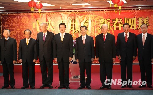 2月22日,中国国民党中央委员新春团拜会在中央党部十二楼举行。图为国民党主席马英九(左四)率党的高层出席团拜会。中新社发 耿军 摄