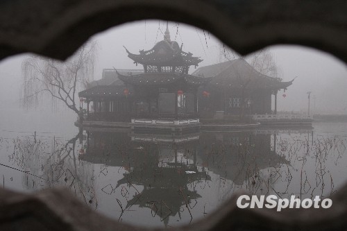 2月23日,江苏省扬州市出现新春首个大雾天气,春雾中的古城别有一番韵味。中新社发 张丙涛 摄