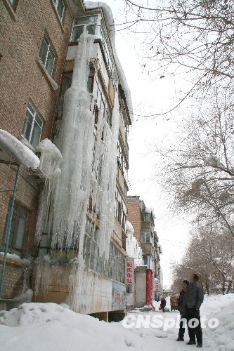 图:新疆阿勒泰居民楼出现“冰瀑”景观(2)