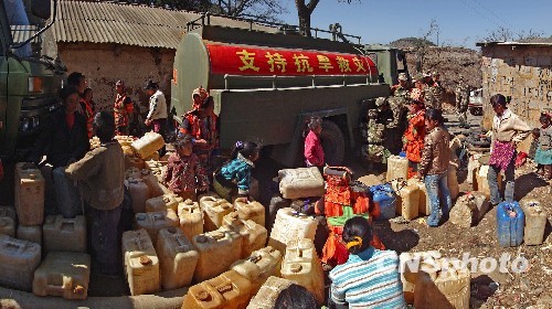 图为2月21日,驻云南省蒙自县的武警部队为山区灾民们送去生活饮用水。中新社发 薛云 摄