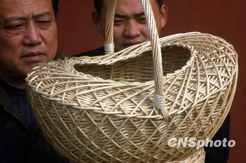近日,山东省郯城县沙墩镇农民张兆明用柳条编成外形似北京奥运会场馆“鸟巢”的水果篮。