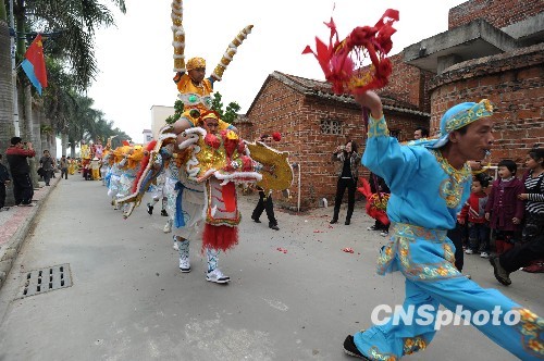 2月23日,农历正月初十,是广东省(湛江市)吴川市吴阳镇芝蔼村的传统“年例”,该村邀请民间艺术团等到村里巡游表演。
