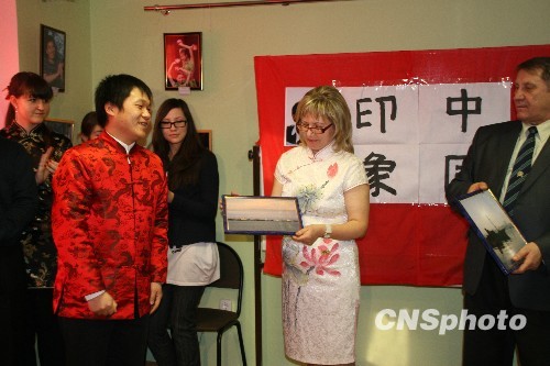 孔子学院书法教师王健霖向俄罗斯阿穆尔州远东国立农业大学赠送摄影作品。中新社发 邱齐龙 摄