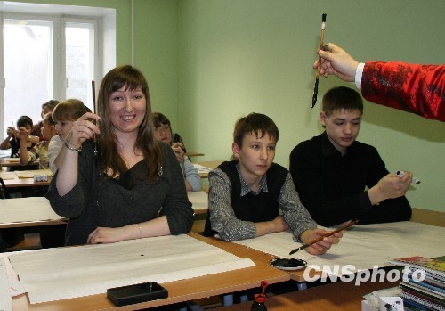俄罗斯学生在学习中国书法。中新社发 邱齐龙 摄