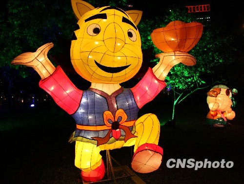 图为台北市政府四周摆放的的花灯“发财虎”。中新社发 耿军 摄