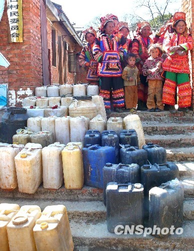 图为蒙自西北勒乡他期口村民在等待部队送水。中新社发 薛云 摄