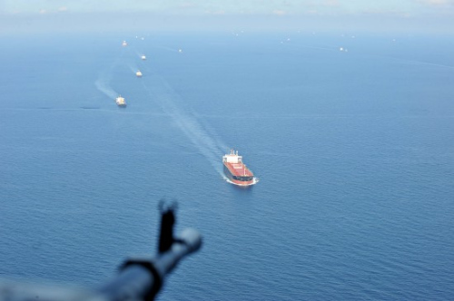 2月25日,在亚丁湾海域,中国海军护航编队直升机加强巡逻飞行,保证船舶安全。杨志刚 摄