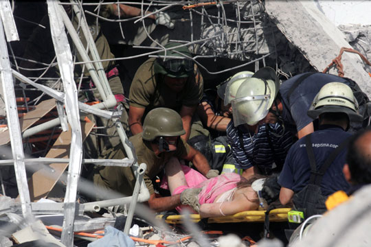 智利康塞普西翁省附近当地时间27日凌晨发生里氏8.8级强烈地震。这次罕见的灾难已造成至少三百多人死亡,死亡人数预料还会上升。图为2月27日,在智利康塞普西翁救援人员在废墟中搜救幸存者。