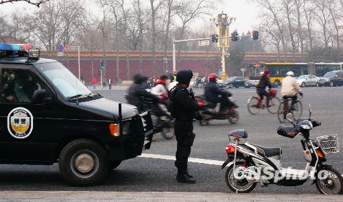 2010年3月3日,特警队员在北京长安街执勤。中新社发 樊甲山 摄