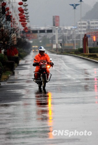市民冒雨在黄山街头骑行。中新社发 方也广德 摄