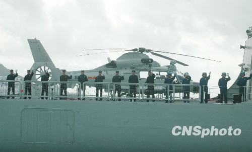 图为官兵们向欢送的人群挥手告别。中新社发 尹海明 摄