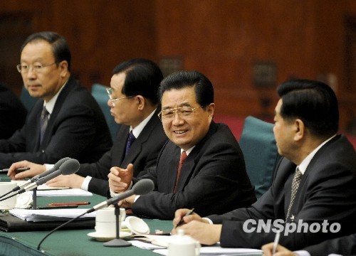 3月4日,中国国家主席胡锦涛来到全国政协民建、工商联委员联组讨论现场,与委员们共商国是,并听取部分委员发言。