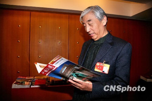 全国政协委员、中国书协主席张海关注《中国新闻》。中新社发 王保胜 摄