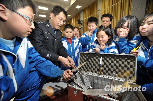 3月12日,北京警方举办“禁止携带管制刀具进校园、创建安全和谐学习环境”主题宣传活动。从即日起,北京警方将陆续在社区、大中小学校、商业场所等人员密集地区开展管制刀具管理宣传工作。中新社发 李连杰 摄