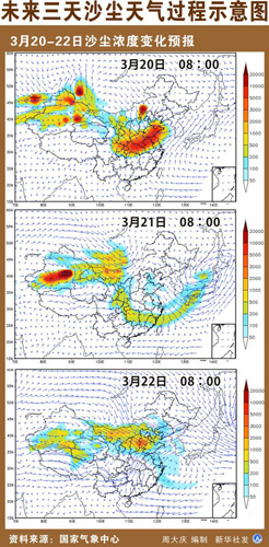中新网3月20日电 中国北方地区近日遭遇今年最强的沙尘天气袭击。新疆、青海、甘肃、北京等北方多个省区出现了沙尘天气,局地还遭遇了强沙尘暴袭击。中央气象台预计,未来沙尘影响范围还将进一步扩大。