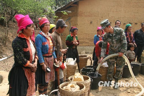素有“八角之乡”的云南省富宁县受特大干旱影响,受灾严重。据统计,截止3月17日,全县干旱已造成的直接经济损失已超过1.5亿元。全县山区农村人畜饮水工程水窖10119口,其中干枯9000口,干旱导致全县25万人畜饮水困难。图为富宁县某边防部队为旱区苗寨百姓送水。中新社发 张敏 摄