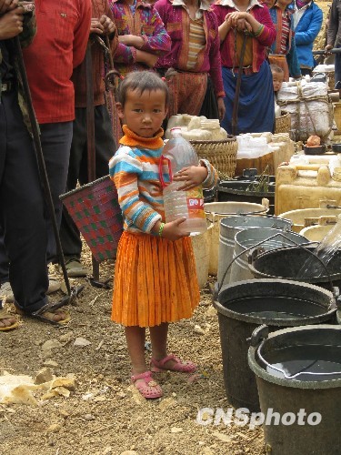 图为富宁县木央镇的苗族小女孩用油瓶背水。中新社发 胡远航 摄