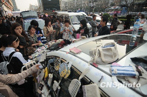 3月28日,婚庆月汽车后备箱集市在杭州某大楼广场举行,20辆汽车后备箱里,各种不同的时尚物品受到市民和游客的青睐。