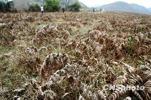 图为在景区中的百里草原景点,遍地都是干枯的杂草。中新社发 富田 摄