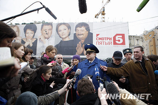 3月29日,在俄罗斯首都莫斯科,一位安全负责人在卢比扬卡地铁站附近接受记者采访。鲁金博 摄