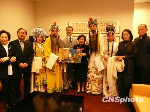 图为台北故宫博物院院长周功鑫与《长生殿》主创人员互赠礼物以表心意。中新社发 闫晓虹 摄