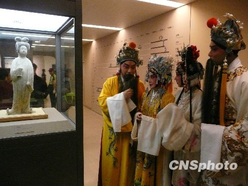 图为剧中饰演唐明皇和杨贵妃的二代演员在台北故宫里欣赏唐代仕女俑。中新社发 闫晓虹 摄
