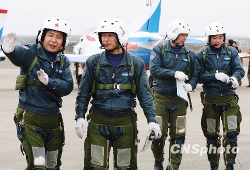 飞行人员交流打靶归来体会。中新社发 耿国庆 摄