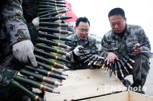 保障人员进行弹药交接。中新社发 耿国庆 摄