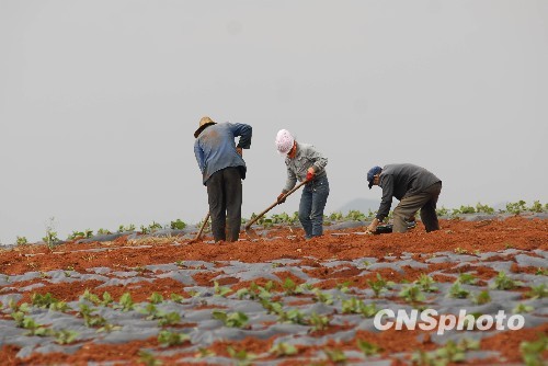 图为3月29日昆明市嵩明县的村民抓紧时机开展备耕忙补种。中新社发 田洪 摄