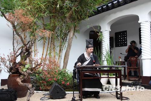 今年的文化盛宴邀请袁中平在故居的庭院内演奏古琴曲。中新社发 耿军 摄