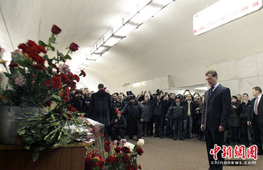 图为俄罗斯总统梅德韦杰夫献上鲜花,向当天在恐怖袭击事件中的遇难者表示哀悼。