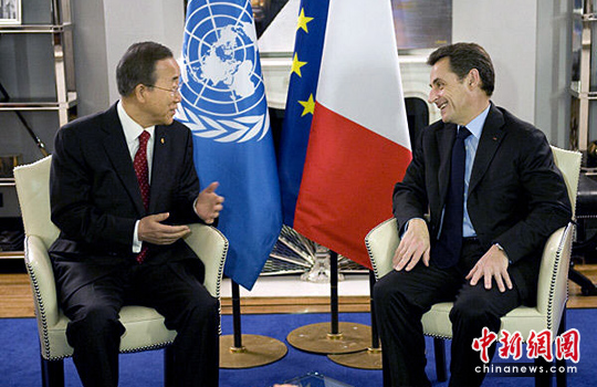 图为3月29日,联合国秘书长潘基文(左)在美国纽约会见到访的法国总统萨科齐。