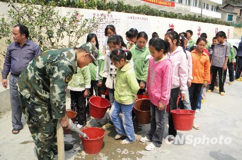 广西各地消防支队官兵为受旱灾影响严重地区送去洁净水。中新社发 刘华星 摄