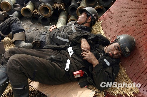3月30日,“3·28”山西王家岭煤矿透水事故抢险工作仍在进行。矿山救护队与矿工们为加快排水进度,夜以继日地工作,不断增添新的排水管道以便尽快救出井下被困矿工。