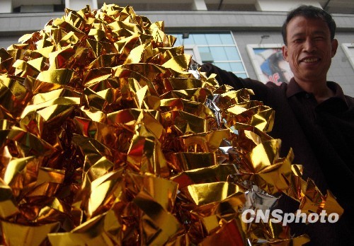 一位商贩在南宁市上海路清明祭品市场向顾客推介祭祖“金锭”。 中新社发 陆波岸 摄