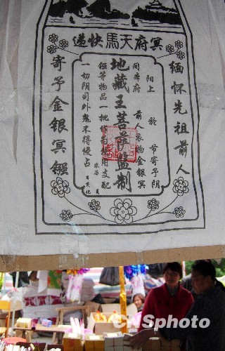南宁市上海路清明祭品市场上摆放的一张祭祖“冥府快递”单。中新社发 陆波岸 摄
